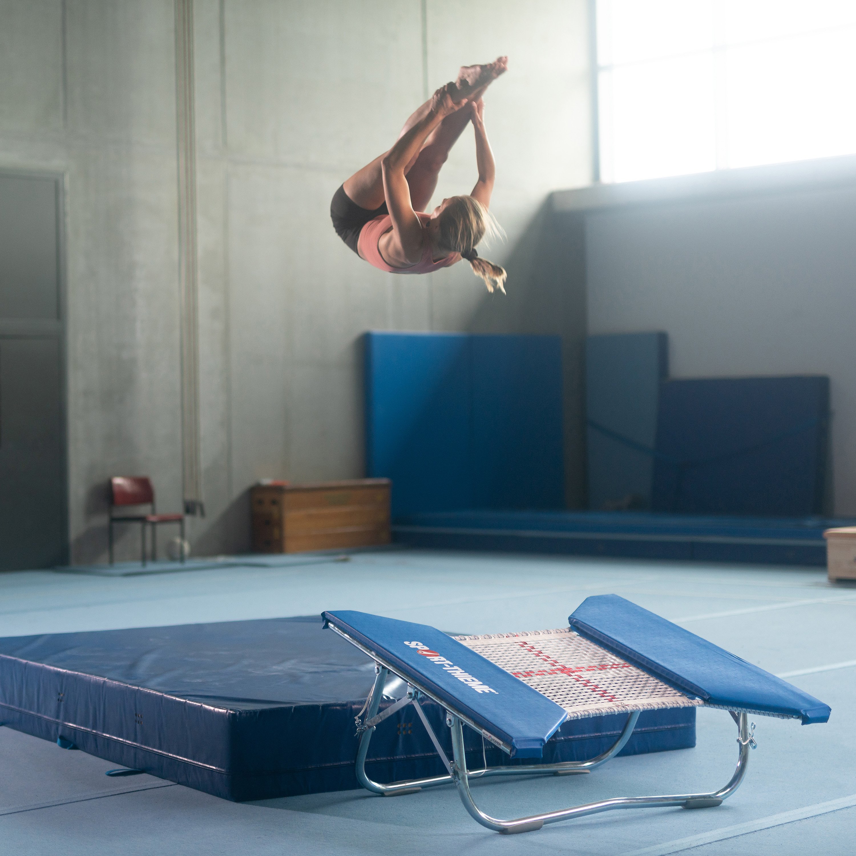 Le saut : un mini-trampoline suivi de tapis pour l’atterrissage.